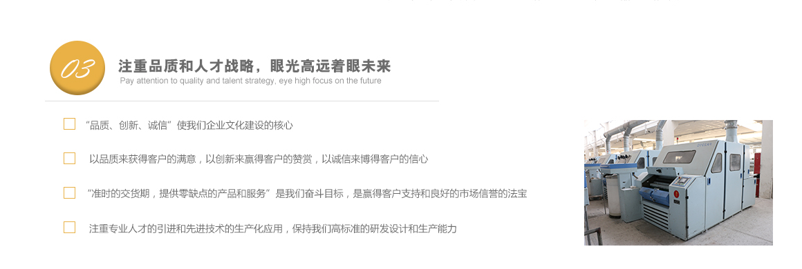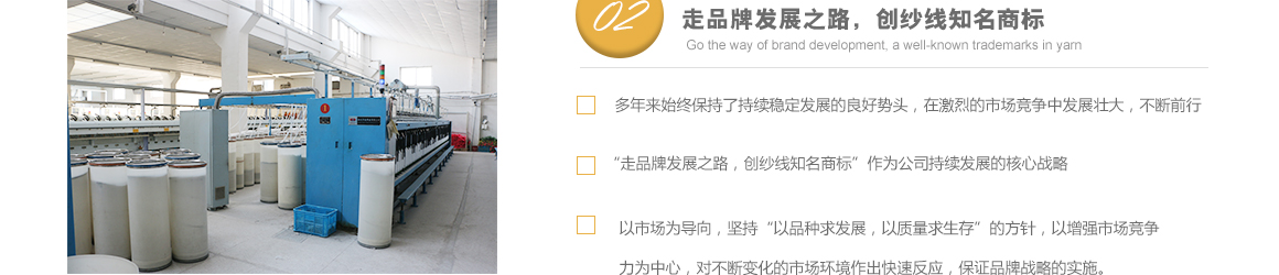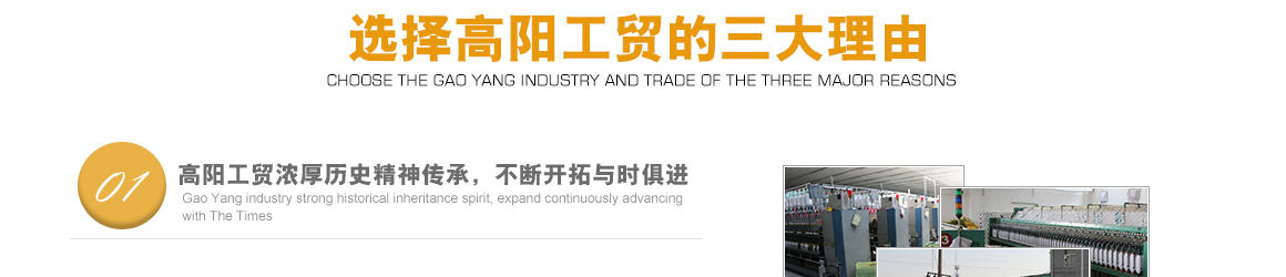 太倉市高陽工貿(mào)有限公司是專業(yè)從事特種紗生產(chǎn)十?dāng)?shù)年的一線生產(chǎn)廠家,坐落于江蘇省蘇州市太倉市雙鳳鎮(zhèn)新湖建湖路29號(hào),太倉隸屬長江三角洲經(jīng)濟(jì)圈,交通便捷,經(jīng)濟(jì)發(fā)達(dá),是著名的紡織生產(chǎn)基地。    公司歷史要追溯到1982年就成立的新湖毛紡織廠。1996年,毛紡織廠與上海二十二棉在新湖聯(lián)合組建了太倉市新湖福利綜合廠。2002年為適應(yīng)市場的飛速變化,公司轉(zhuǎn)制重組更名為太倉市高陽工貿(mào)有限公司。同時(shí)公司適時(shí)調(diào)整生產(chǎn)經(jīng)營策略,調(diào)整產(chǎn)品品種結(jié)構(gòu),把生產(chǎn)特種紗作為主要發(fā)展方向,純棉、滌綸竹節(jié)紗是我們的主要產(chǎn)品。    公司多年來始終保持了持續(xù)穩(wěn)定發(fā)展的良好勢頭,在激烈的市場競爭中發(fā)展壯大,不斷前行。我們把“走品牌發(fā)展之路,創(chuàng)紗線知名商標(biāo)”作為公司持續(xù)發(fā)展的核心戰(zhàn)略。以市場為導(dǎo)向,堅(jiān)持“以品種求發(fā)展,以質(zhì)量求生存”的方針,以增強(qiáng)市場競爭力為中心,對不斷變化的市場環(huán)境作出快速反應(yīng),品牌戰(zhàn)略的實(shí)施。公司注重專業(yè)人才的引進(jìn)和先進(jìn)技術(shù)的生產(chǎn)化應(yīng)用,具備較強(qiáng)的研發(fā)設(shè)計(jì)和生產(chǎn)能力。    公司一直把“品質(zhì)、創(chuàng)新、誠信”作為企業(yè)文化建設(shè)的核心。以品質(zhì)來獲得客戶的滿意,以創(chuàng)新來贏得客戶的贊賞,以誠信來博得客戶的信心。我們把“準(zhǔn)時(shí)的交貨期,提供零缺點(diǎn)的產(chǎn)品和服務(wù)”作為奮斗目標(biāo),贏得了客戶的支持和良好的市場信譽(yù)。  高陽工貿(mào)有限公司愿與廣大客戶加強(qiáng)合作,共享信息,迎接挑戰(zhàn),共同發(fā)展。客戶需求。了解詳細(xì)>>